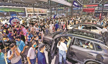 7月17日,2021粤港澳大湾区车展启幕,国内外百余汽车品牌携千款车型亮相,其中有近50款新车发布。作为深圳今年疫情后的首展,时值周末的展会客流如潮,展馆里挤满了密密麻麻的观众,一如往昔。 视觉中国 供图