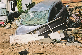 这是7月17日在德国西部城镇巴特明斯特艾弗尔拍摄的洪水损毁的汽车。新华社发(唐颖 摄)