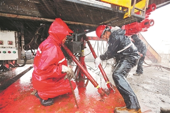 7月12日突降暴雨,冀东油田井下作业公司试油12队队员沉着应对,按照汛期应急预案进行操作。 杨军 摄