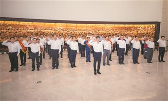 7月20日上午,全总机关党员干部在中国共产党历史展览馆重温入党誓词,表达不忘初心、牢记使命,以实际行动弘扬伟大建党精神,为党的工运事业矢志奋斗的坚定决心。本报记者 王伟伟 摄