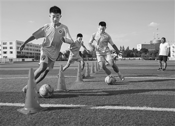 学生在宁夏盐池县第一中学运动场进行足球训练(7月15日摄)。