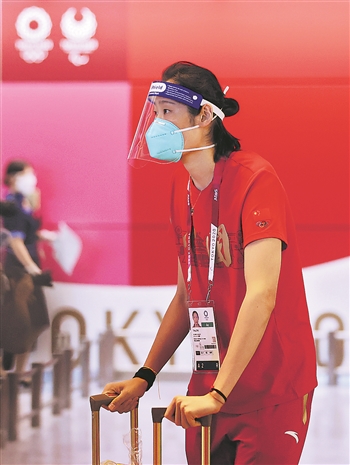 7月19日,东京奥运会开幕式中国体育代表团旗手、中国女排队员朱婷抵达东京成田机场。当日,参加东京奥运会的中国体育代表团部分成员抵达东京。 新华社记者 孟永民 摄