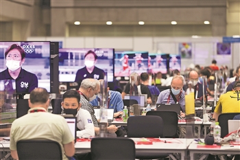 图为7月22日,东京奥运会主新闻中心内一片忙碌。 本报特派记者 杨登峰 摄
