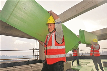 7月20日,中建二局长沙金茂建发·铂悦项目施工现场,工人在进行屋顶防水作业。进入炎热夏天,湖南长沙市区连续多日出现35℃以上的高温天气,该项目安排工人错时上班,避开高温时段,确保职工安全健康。 李健 摄/人民图片