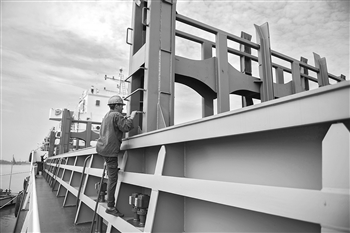7月21日,在位于沅江市船舶制造小镇的湖南金航船舶制造有限公司船舶制造工地,工人在观察制造中的轮船状态。