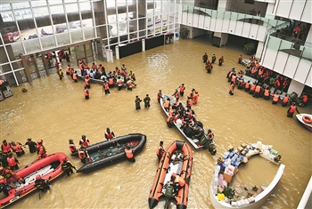 7月22日,在河南郑州阜外华中心血管病医院门诊部,救援人员在积水的大厅内驾驶舟艇转移病患。 新华社记者 姚竣译 摄