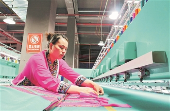 7月16日,贵州省从江县美娥社区祖英刺绣有限公司车间内,工作人员正在生产刺绣产品。近年来,当地大力发展社区产业,拥有从传统服装设计、加工、销售,到面辅料供应、物流仓储的产业链,助推群众增收致富。