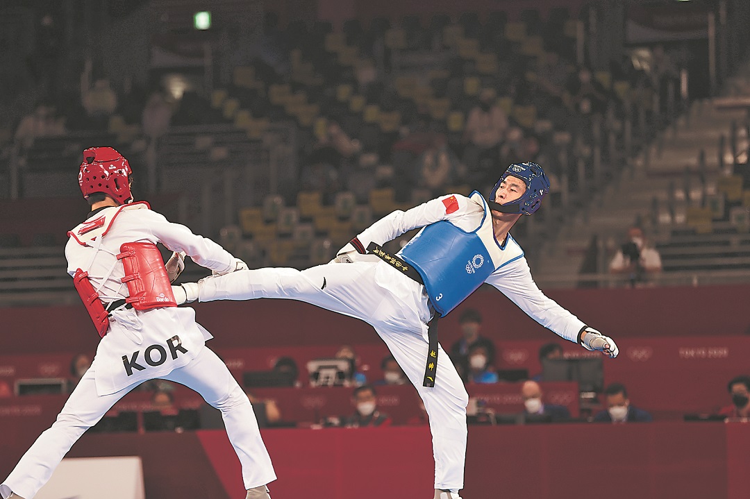7月25日晚8时,东京奥运会跆拳道男子68公斤级铜牌赛上,中国奥运旗手、上届58公斤级冠军赵帅以17比15战胜韩国名将李大勋,为中国代表团再添一枚铜牌!此前的半决赛中,赵帅在前两局大比分领先的情况下,第三局9比24惜败,以总分25比33不敌对手,遗憾失去夺冠机会。本报特派记者 杨登峰 摄