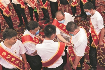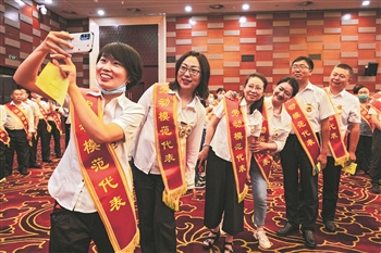 7月21日上午,劳模们在准备拍摄大合照前,相互查看挂在胸前的奖章。