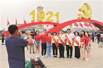 7月25日上午,劳模们来到天安门广场,北京大学医学部暑期社会实践团的同学们看到劳模代表后主动要求合影纪念。