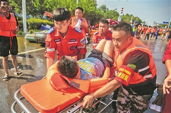 7月27日,河南新乡卫辉,救援人员正在转运患者。本报记者 王伟伟 摄