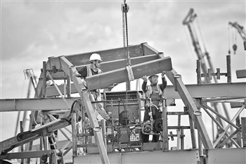 近日,海口国际免税城免税商业中心主体结构施工完毕,目前工人们在进行玻璃幕墙及屋面网架结构样板施工。海口国际免税城项目总建筑面积约92.6万平方米,预计2022年正式营业。