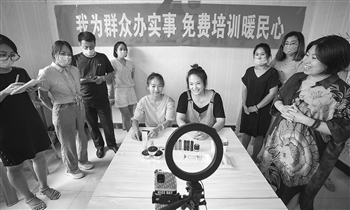 7月28日,在黄骅市设立的一处免费职业技能培训点,学员在学习网络直播销售技能。
