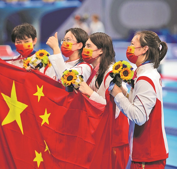 7月29日,在东京奥运会游泳女子4×200米自由泳接力决赛中,中国队打破世界纪录并夺冠。本报特派记者 杨登峰 摄