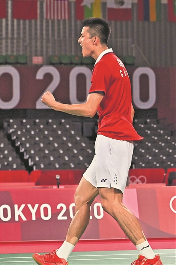 7月29日,东京奥运会羽毛球男子单打比赛中,中国选手谌龙以2比1逆转战胜马来西亚选手李梓嘉,艰难晋级8强。新华社记者 朱峥 摄