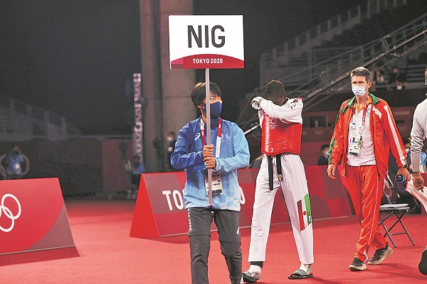 7月25日,在跆拳道女子57公斤级铜牌赛中,尼日尔选手耶索夫(图中)不敌中国台北选手罗嘉翎,赛后难掩失落。