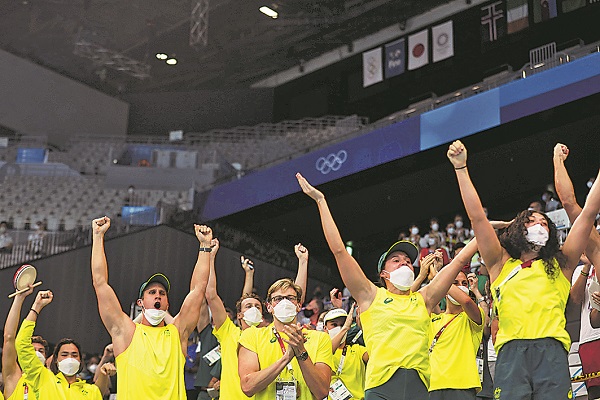 7月29日,在女子800米自由泳比赛中,澳大利亚游泳队队员在看台上为本国选手加油。