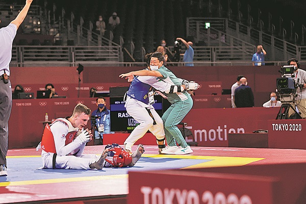 7月25日,在跆拳道男子68公斤级决赛中,英国选手辛登(左一)输掉比赛坐在台上,获得冠军的乌兹别克斯坦小将拉什托夫与教练相拥欢庆胜利。