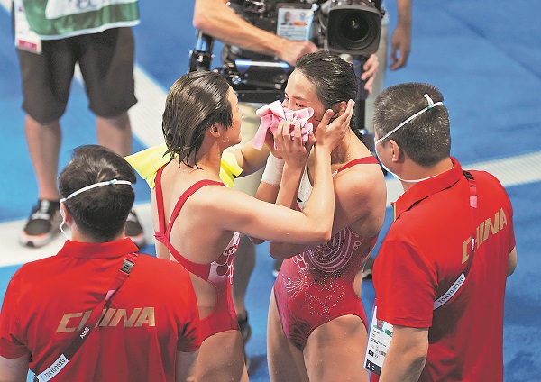 7月25日,在跳水女子双人3米板决赛获胜后,中国选手王涵(右二)、施廷懋喜极而泣。