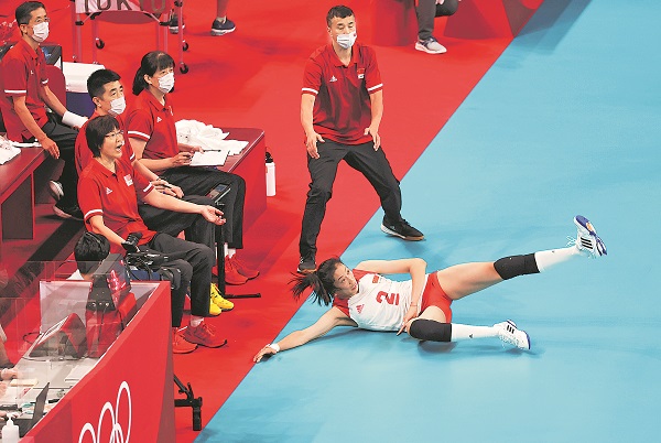 7月29日,在女排小组赛中,带伤出战的中国女排主攻朱婷飞身救球。