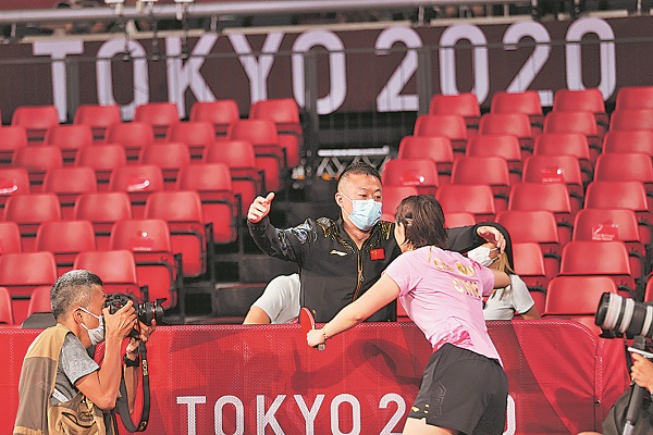 7月29日,在乒乓球女子单打决赛结束后,获胜的陈梦(图右)与教练马琳拥抱庆祝。