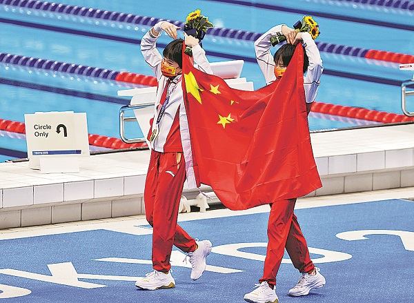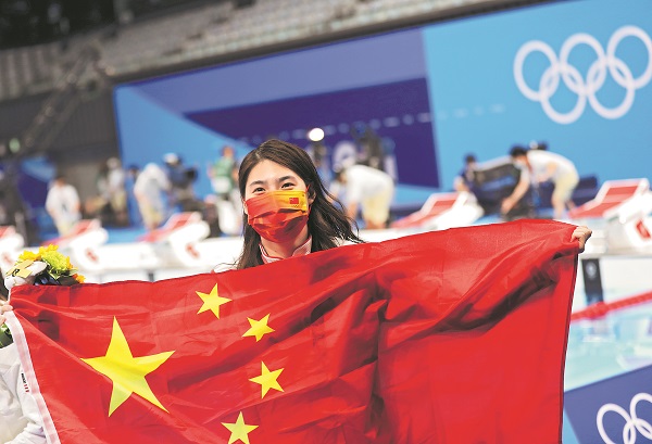 7月29日,在东京奥运会女子200米蝶泳决赛中,张雨霏夺得金牌并破奥运纪录。赛后,张雨霏展示五星红旗庆祝胜利。
