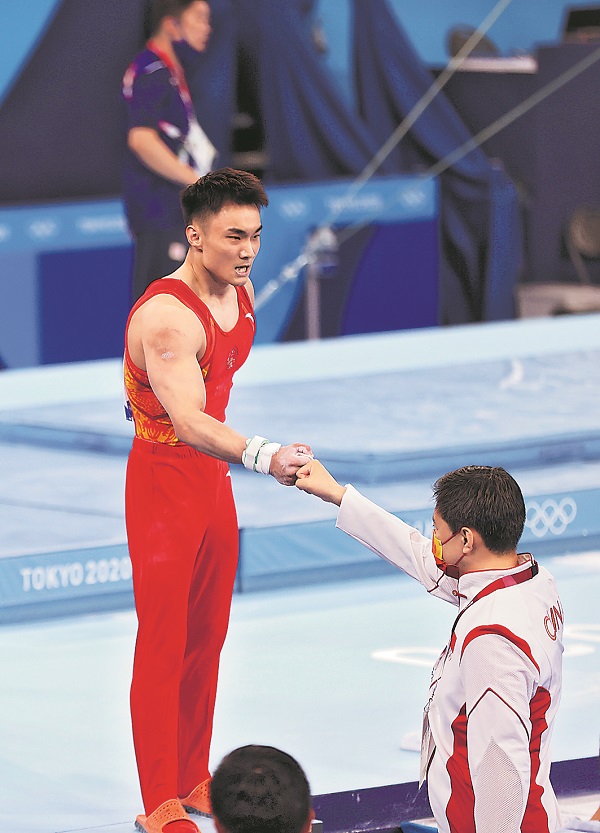 7月26日,在体操男团决赛中,孙炜(图左)在完成比赛项目后与教练击拳相庆。