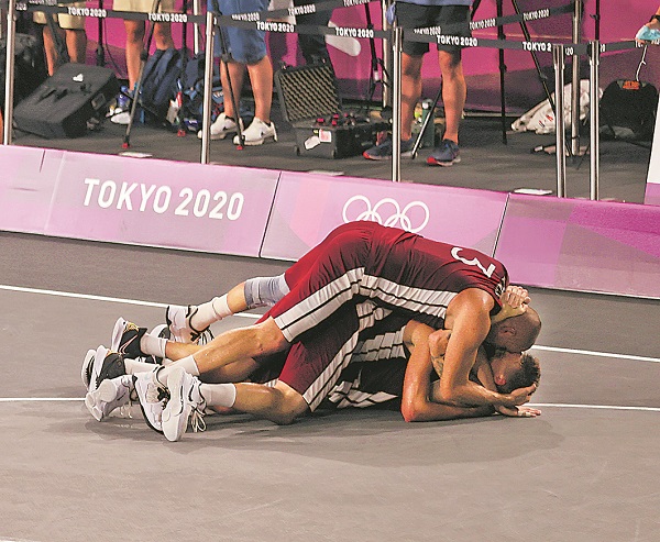 7月28日,在奥运会新增项目三对三篮球决赛中,拉脱维亚队的队员们获胜后倒地庆祝。