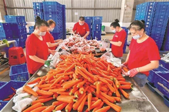 8月1日,在位于长沙市望城区的湖南高星物流园,蔬菜仓库的工作人员在分拣胡萝卜。