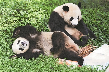 7月29日,在重庆动物园,大熊猫在玩冰“消暑”。近来重庆连日高温,重庆动物园为了让动物们清凉度夏,采用多种“妙招”为动物们防暑降温。新华社记者 唐奕 摄