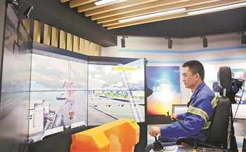 现在,在位于张家港港务集团港埠分公司的“黄强劳模创新工作室”,坐在门机操作模拟器上,戴上VR眼镜,就仿佛置身码头,手握操作杆,即可进行“吊装”操作。极大节省了门机实操练习的成本。