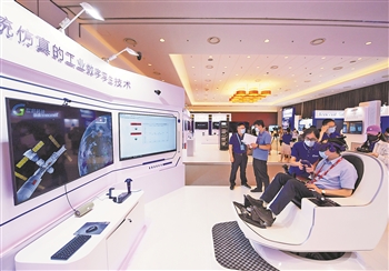 8月2日,参观者在2021全球数字经济大会上体验工业数字孪生技术。