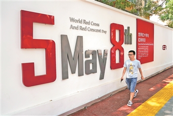 市民在西安市雁塔区昌明路红十字文化主题街区行走(8月3日摄)。