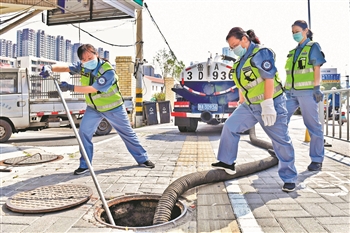 8月4日,山东省济南市城管局城肥清运管理一处女子清疏班的三名女队员在裕园社区一处居民楼前一阵忙碌。
