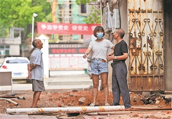 8月4日,邵武市通泰街道月山关社区志愿者李学英(中)在该区居民肖小生家门前协调小巷雨水管网改造问题。