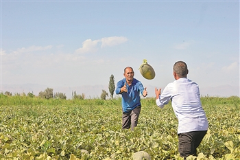 在伽师县卧里托格拉克镇的瓜田里,瓜农在采摘伽师瓜(8月4日摄)。