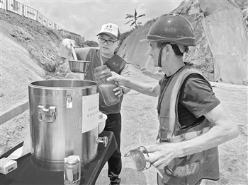 在广西横州大桥项目工地,志愿者为农民工送上绿豆汤解暑。