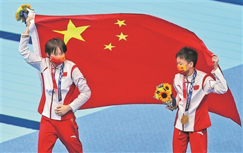 全红婵(右)和陈芋汐身披国旗庆祝。本报特派记者 杨登峰 摄