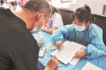 8月5日,在呼和浩特市回民区新冠疫苗第一临时接种点,工作人员(右)指导市民填写《新型冠状病毒疫苗接种知情通知书》。新华社记者 贝赫 摄