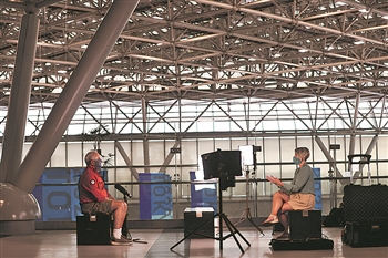 7月30日,记者在媒体中心进行采访,根据防疫要求,记者与受访者拉开了一定距离。