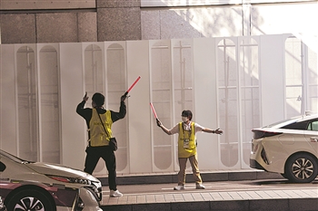 7月31日,媒体中心的志愿者指挥交通。本届奥运会,大量的志愿者付出了辛勤的劳动。