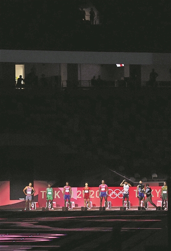 8月1日晚,备受瞩目的男子100米决赛举行。比赛开始前上演灯光秀时,一位工作人员从楼上看台向下观望。
