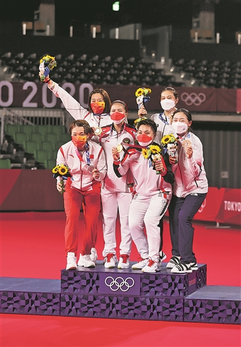 8月2日,东京奥运会羽毛球女双比赛的6名获奖选手一起站在冠军台上合影留念。