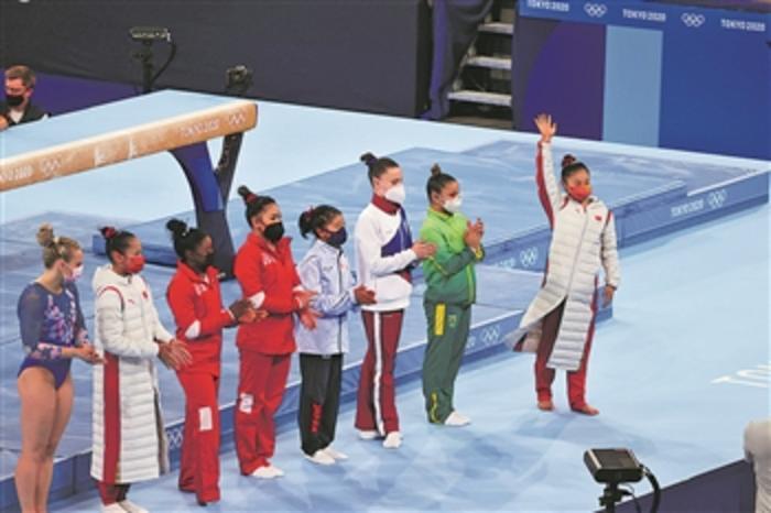 8月3日,在女子体操单项比赛进行前,选手们全部佩戴口罩入场。