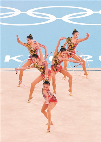 8月8日,在东京奥运会艺术体操团体全能决赛中,中国队获得第四名。新华社记者 杨磊 摄