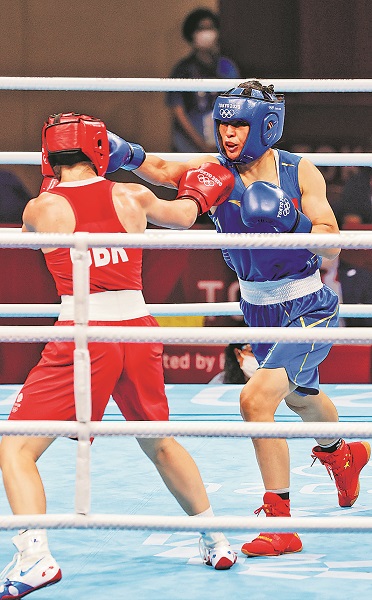 8月8日,在东京奥运会女子拳击75公斤级决赛中,中国选手李倩(右)拿到一枚银牌。本报特派记者 杨登峰 摄