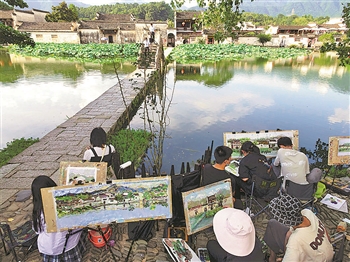 8月8日,安徽省黄山市黟县宏村景区吸引游客来此写生。1999年,联合国教科文组织将皖南古村落宏村列入世界文化遗产名录。吴寿宜 摄/中新社