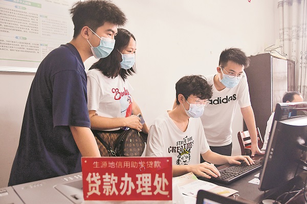 8月9日,大学新生和家长在湖南省永州市江永县国家助学贷款中心办理生源地信用助学贷款。新学期前夕,江永县教育局积极开展生源地信用助学贷款业务,简化审批手续,一次就办好,绝不让一名大学生因贫困而辍学。截至目前,该县已为560名家庭困难大学生办理助学贷款,帮助他们圆上大学梦。本报通讯员 田如瑞 摄