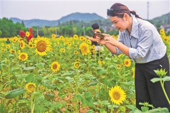 8月10日,游客在南山村特色度假小镇的向日葵花田里拍照。