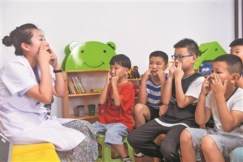 8月11日,东林卫生院的党员志愿者医生指导孩子们做眼保健操。